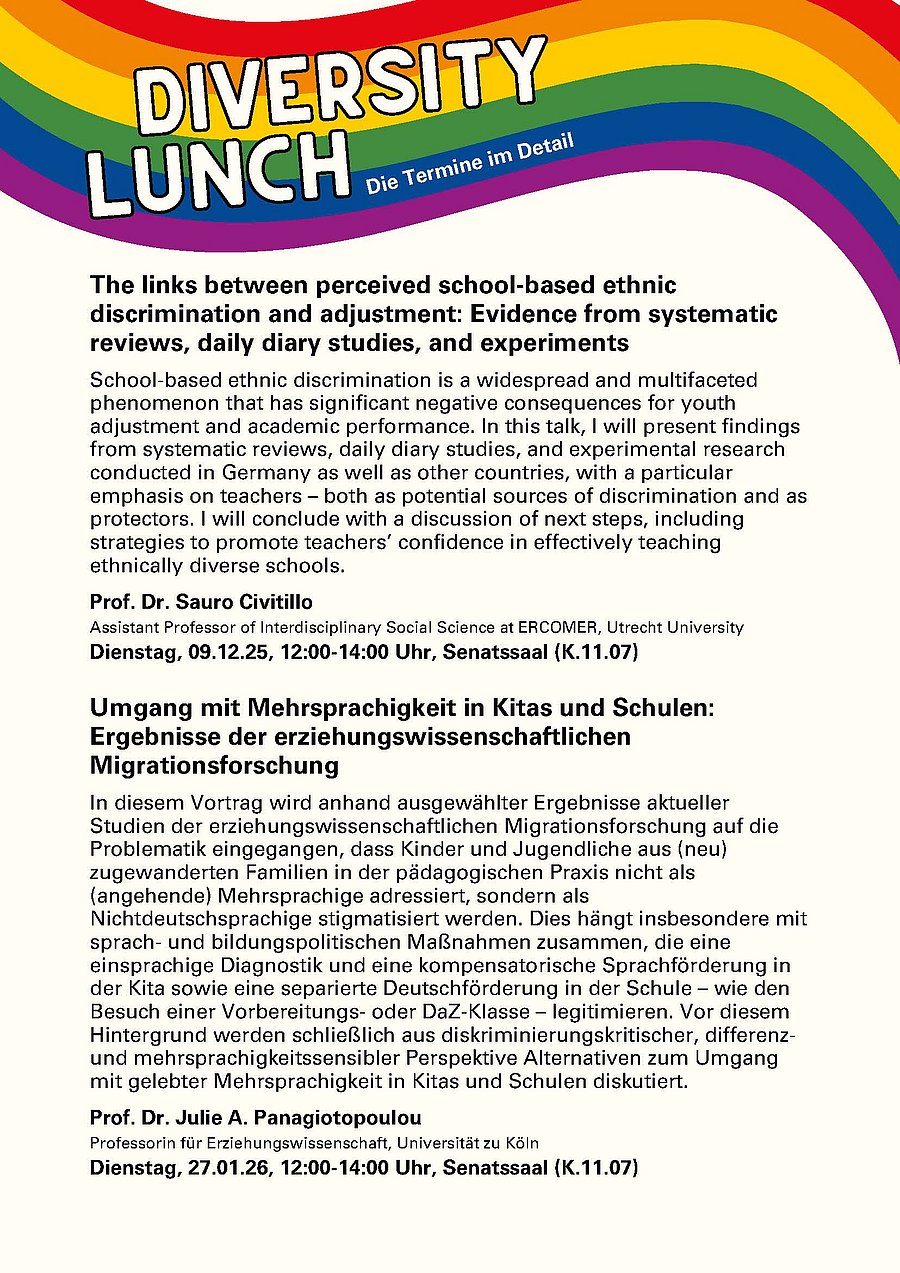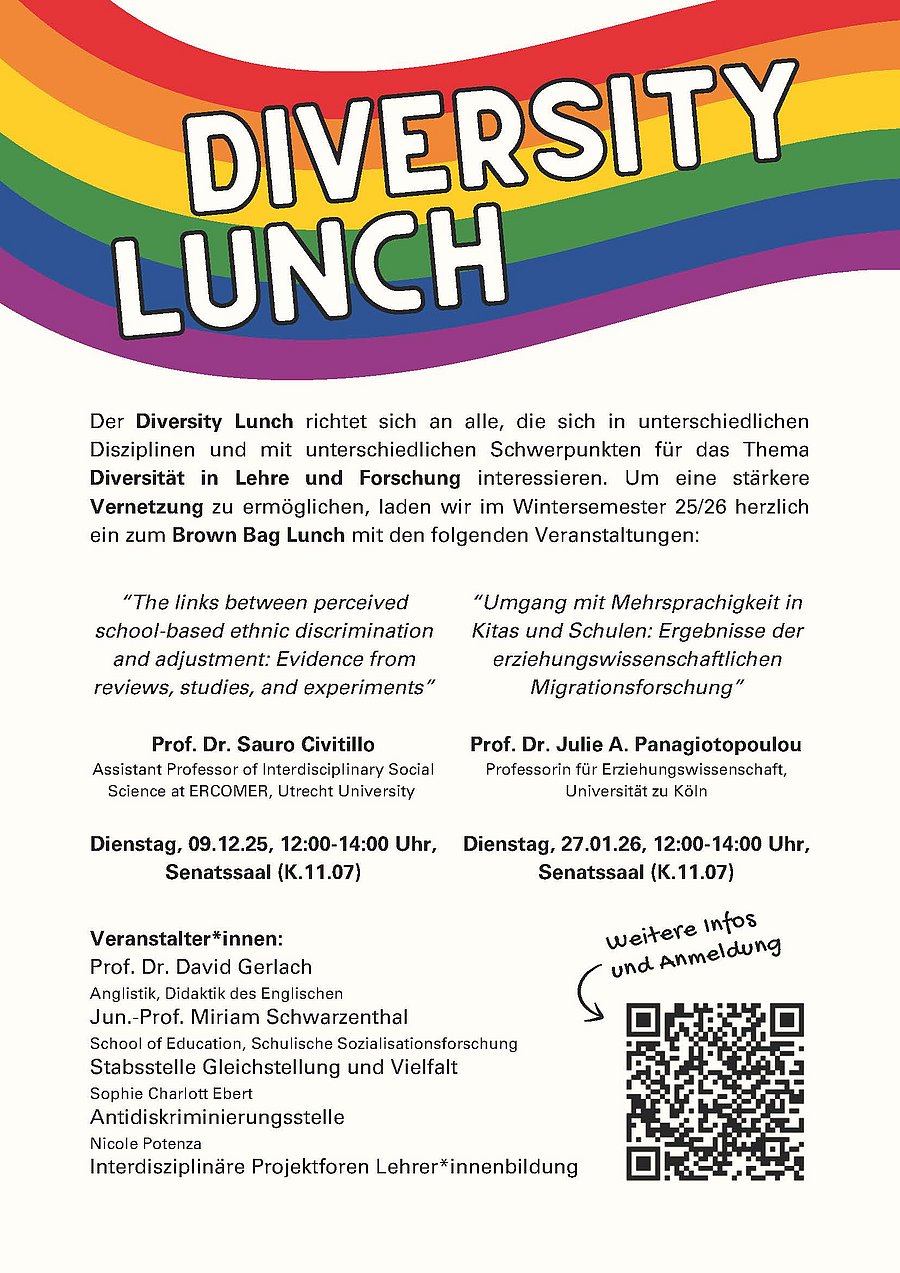 Der Diversity Lunch richtet sich an alle, die sich in unterschiedlichen Disziplinen und mit unterschiedlichen Schwerpunkten für das Thema Diversität in Lehre und Forschung interessieren. Um eine stärkere Vernetzung zu ermöglichen, laden wir im Wintersemester 2025/26 alle Interessierten herzlich zum Brown Bag Lunch ein. Die Veranstaltungen starten jeweils um Punkt 12:00 Uhr mit der Möglichkeit der informellen Vernetzung, die Vorträge beginnen dann um 12:15 Uhr.